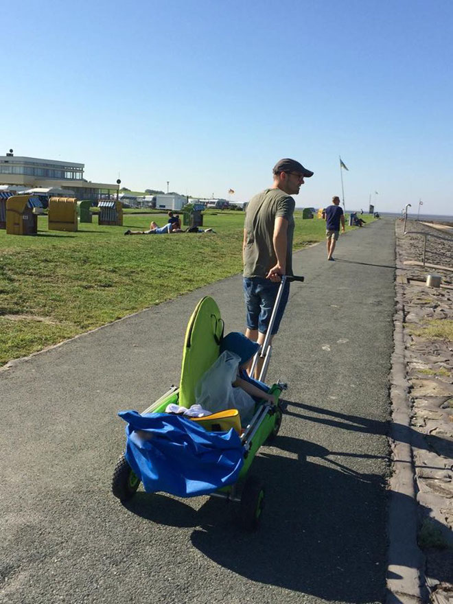 Mit Sack und Pack ziehen wir an den Strand von Usedom. Der ulfBo leistet großartige Dienste. Herzliche Grüße E.W., Straubing